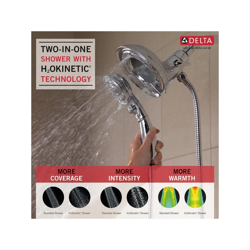 The Delta In2ition Two-in-One Shower features a detachable hand shower which can be used separately from or simultaneously with the shower head. This integrated dual-functionality gives you maximum flexibility without sacrificing warmth, as you can choose to have water streaming from the shower head only, the hand shower only or both the shower head and hand shower at once. Delta H2Okinetic Showers look different because they are different. Using advanced technology, H2Okinetic showers sculpt water into a unique wave pattern, giving you 3X the coverage of a standard shower head.* The end result is a shower that provides more coverage, more warmth and more intensity for a truly drenching shower experience. So go ahead and indulge, because now you can enjoy the feeling of more water without using more water. Delta MagnaTite Docking uses a powerful integrated magnet to pull your faucet spray wand or In2ition hand shower precisely into place and hold it there so it stays docked when not in use. The pause setting gives you ample space for shaving, lathering and other shower tasks, then easily restarts the water with the temperature where you left off. This spray setting helps you conserve water, so you can worry less about depleting your supply of hot water – and you help the environment too. Create a luxurious shower experience with a Delta hand shower/shower head combination. Whether you’re remodeling your space or upgrading your existing setup, our hand shower/shower head combos will give you more flexibility and coverage in a variety of stunning styles.