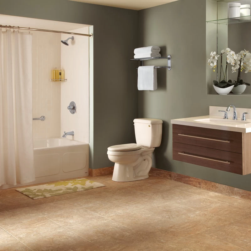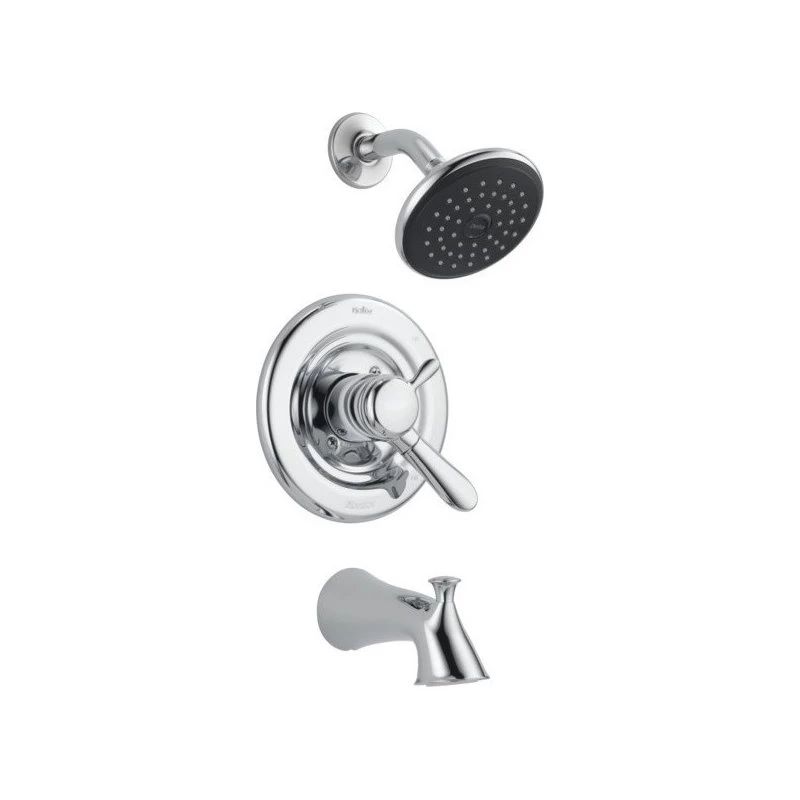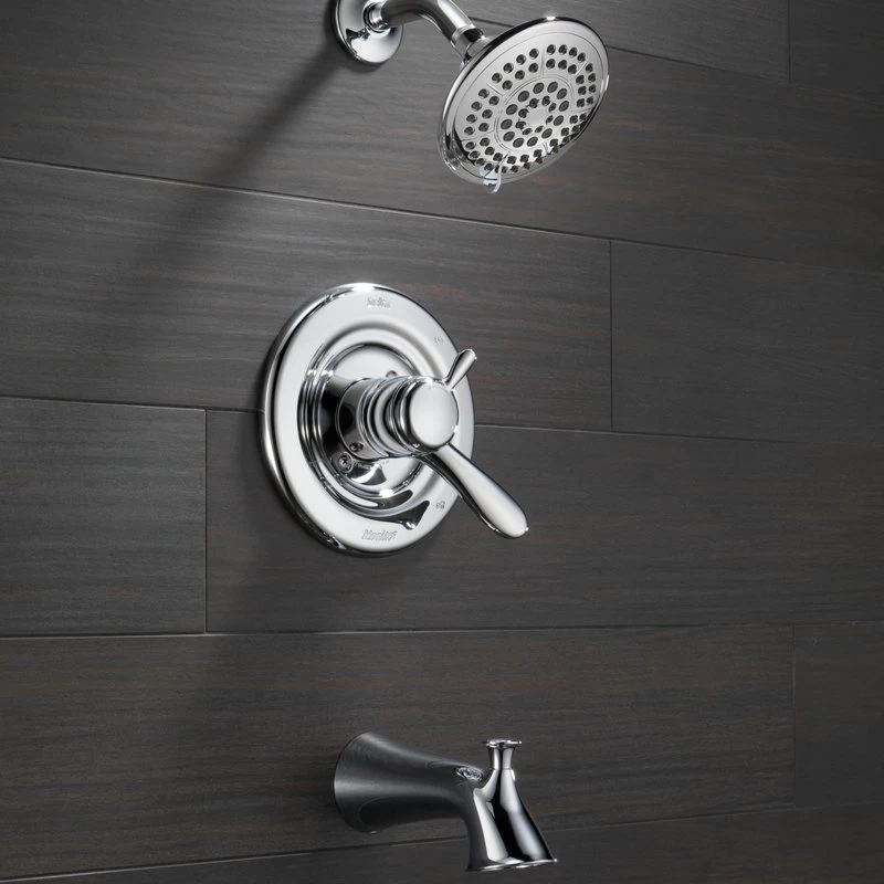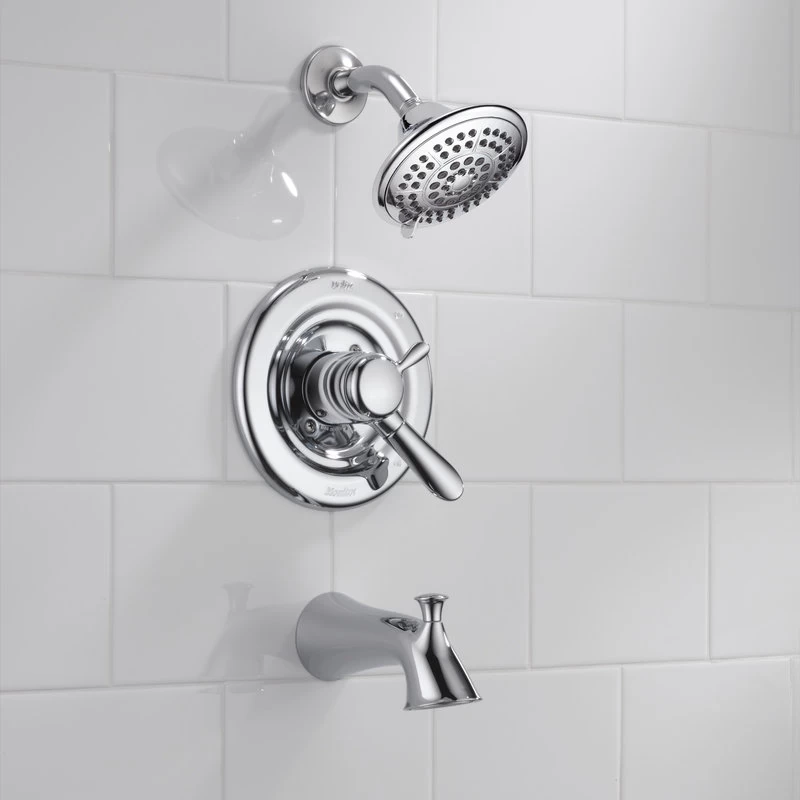 With separate handles for volume and temperature control, this Delta tub/shower provides a more refined showering experience. Simply set the water at your preferred temperature and turn the shower on or off with the volume control handle – without interrupting your set temperature. Delta pressure-balance valves use Monitor Technology to protect you and your family from sudden temperature changes. The pause setting gives you ample space for shaving, lathering and other shower tasks, then easily restarts the water with the temperature where you left off. This spray setting helps you conserve water, so you can worry less about depleting your supply of hot water – and you help the environment too. While other products may gather unsightly mineral build-up over time, Delta soft rubber Touch-Clean spray holes allow any mineral residue to simply be wiped away for an instantly refreshed look with no need for soaking or the aid of chemical cleaners.